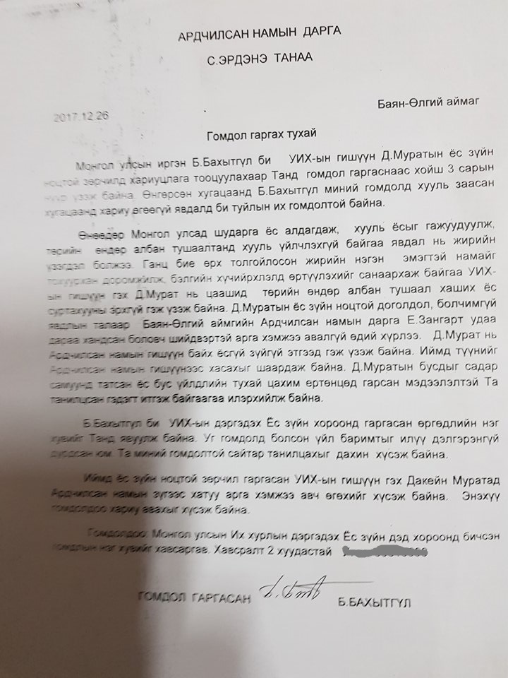 - Миний гомдол Баян-Өлгий аймагт шалгагдаж байгаа. Анх 12 дугаар сарын 4-нд Эрүүгийн Цагдаагийн хэлтсийн 4-р тасгийн ахмад Түвшинбаярт хэргийн тухай бүх мэдээллийг өгсөн. Миний гомдлыг хүлээж авсан цагдаа намайг Мураттай эвлэрч, тохиролцохыг шаардаж байсан юм. Саяхан би хотод очоод Мураттай уулзсан. Зургаан цагийн турш намайг гомдлоо татаж авахыг ятгасан. Тэр үед Мурат хэлэхдээ “Олон хүн миний талд байгаа. Тиймээс чи юу ч хийж чадахгүй. Би Баттулга Ерөнхийлөгчтэй найз. Тиймээс миний талд шийдвэр гарна. Та нар хуулиар юу ч олж долоохгүй” гэсэн. Энэхүү яриаг би бичиж авсан. Нотолгоо байгаа. Өчигдөр миний фэйсбүүкийг хакердан мессенжэрт буй мэдээллийг устгахыг оролдсон байсан. Азаар би фэйсбүүкийн кодоо сольж мэдээллээ хадгалж үлдсэн.