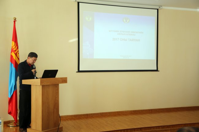Шүүхийн ерөнхий зөвлөлийн Гүйцэтгэх нарийн бичгийн дарга Т.Мэндсайхан "Ажлын алба 2017 онд 9 зорилт тавьж, нийт 227 чиглэлийн ажил төлөвлөсний 80.3 хувийг нь биелүүлж ажиллалаа” хэмээн онцлоод, шүүхийн үйлчилгээний соёлыг төлөвшүүлэх, хэргийн хөдөлгөөний удирдлагыг сайжруулах, шүүхийн хараат бус, аюулгүй байдлыг хангах чиглэлээр хийсэн ажлуудаа товч танилцуулсан юм.