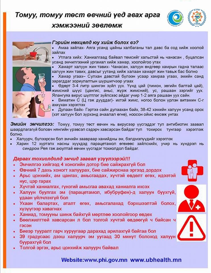 Амьсгалын замын цочмог халдвар, ялангуяа томуу, томуу төст өвчний үед гэрийн нөхцөлд хийх асаргаа сувилгаа болон эмчилгээний арга замуудын талаар Нийслэлийн эрүүл мэндийн газраас гаргасан энэхүү зөвлөмжийг сонирхоорой.