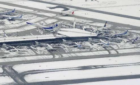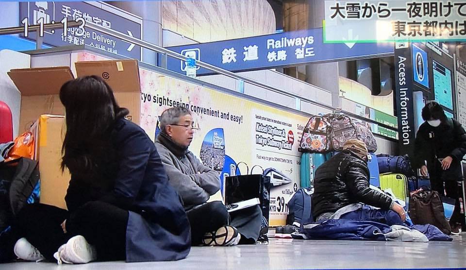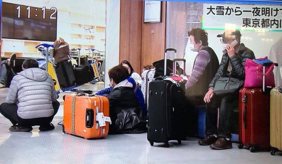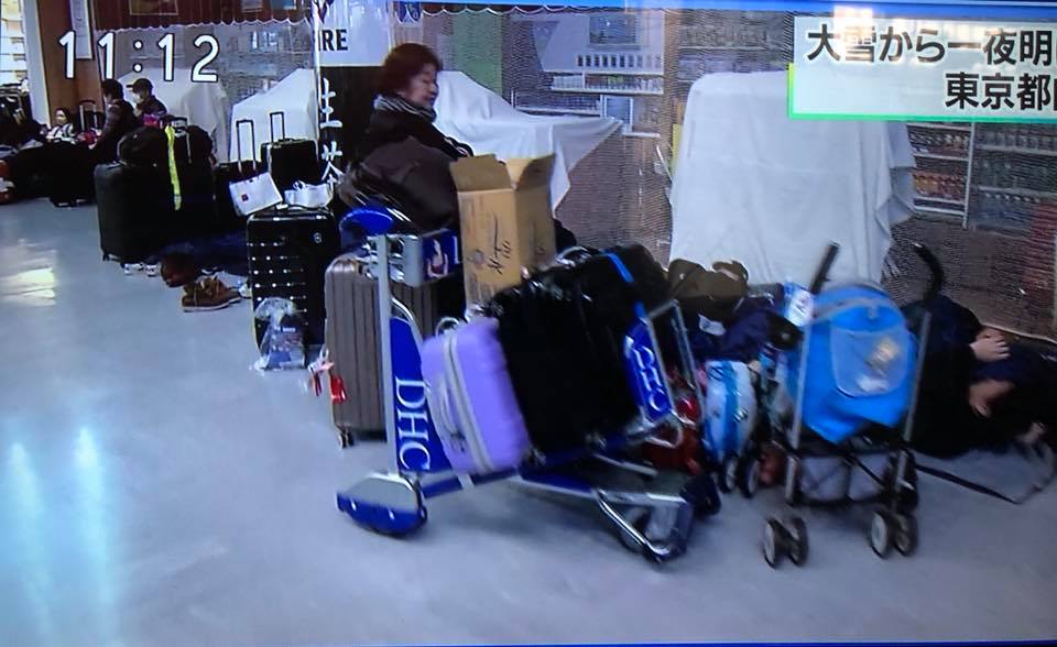 Мөн цас орсонтой холбоотойгоор Нарита олон улсын нисэх онгоцны буудал нислэгүүдээ хойшлуулжээ. Өчигдөр оройн 19:00 цагаас хойш хоёр нисэх зурвасаа хааж, нийт 142 онгоцны нислэгийг аюулгүйн улмаас цуцалжээ. Нарита буудлаас нисэх болон уг буудалд буусан үйлчлүүлэгч бүгд нийлээд 9000 гаруй хүн онгоцны буудалд хоносон байна. Хүмүүсийн аюулгүй байх орчныг бүрдүүлж, идэх хоол, унтах хэрэглэл хөнжлөөр хангасан гэсэн мэдээллийг олон нийтэд мэдээллэжээ. Иргэдийг нисэх онгоцны буудалд хонуулах болсон шалтгаан нь гадаа хүйтэн бөгөөд цасанд зам боогдож түгжирсэн учир амь насанд аюултай хэмээн үзэж, хонуулах арга хэмжээг авсан байна. Нарита нисэх онгоцны буудлынхан “Холоос ирсэн зорчигчийн онгоц нэгэнт цасны улмаас хойшлогдсон учир хонохоос өөр аргагүй учир бид бүх хүчээ дайчилж ая тухыг хангаж байна” хэмээн мэдэгджээ.