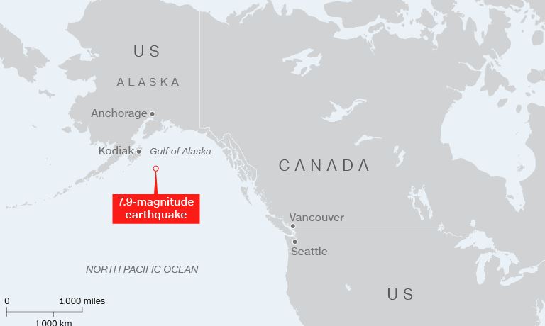 АНУ болон Канадын баруун эрэгт Аляскийн буланд рихтерийн шаталбараар өчигдөр 8,2 баллын хүчтэй газар хөдлөлт болсон ба 7,9-8,2 баллын хүчтэй 5 удаагийн түлхэлт болжээ. Газар хөдлөлтөөс үүдэн цунами үүсч болзошгүй хэмээн нутгийн оршин суугчдыг яаралтай нүүхийг сануулсан байна.