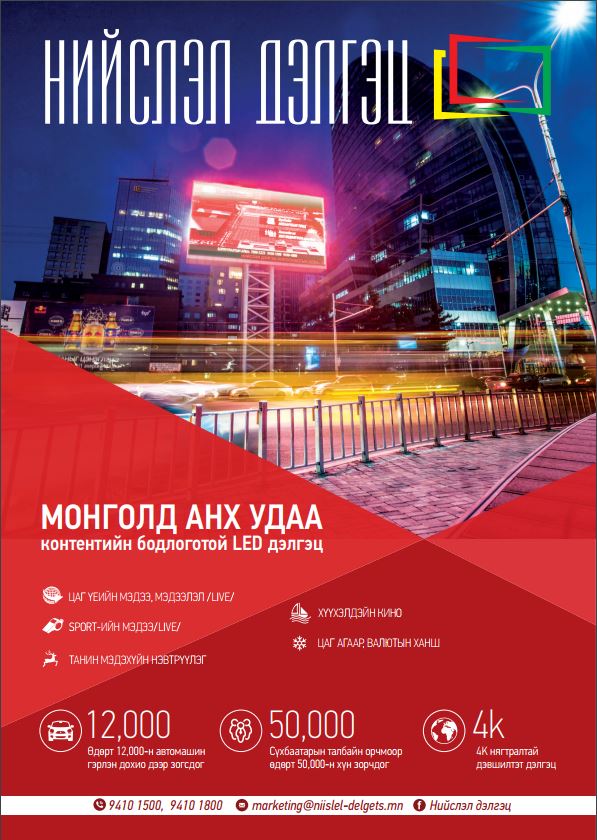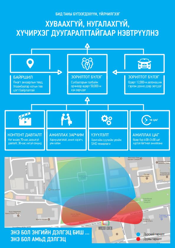 - Сүхбаатарын талбай орчмоор өдөрт дунджаар 50,000 хүн явган зорчдог, ойролцоо авто замын уулзвараар 12,000 автомашин нэвтэрдэг, тус талбай орчмоор сард дунджаар 5 арга хэмжээ зохион байгуулагддаг, давтагдсан тоогоор сард дунджаар 2,500,000 хүн таны сурталчилгааг үзнэ гээд бодохоор үнэхээр давуу талтай.