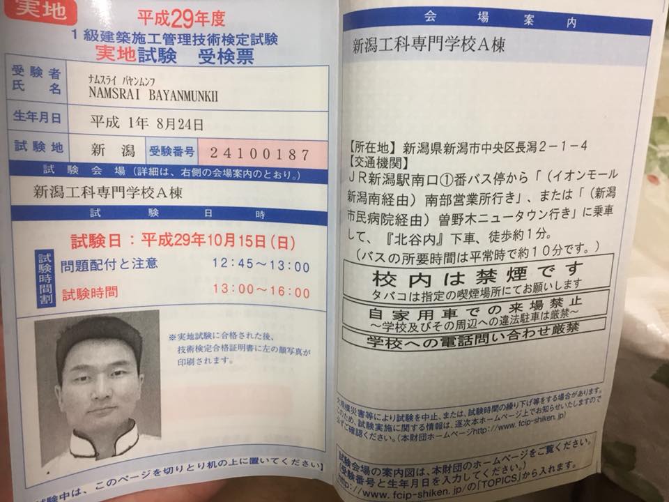 Японы барилгын инженерийн тэргүүн зэргийг авлаа. Энэ зэргийг авч байгаа анхны Монгол хүн болж байгаа. Жилийн өмнө ээжийн оёж өгсөн монгол цамцыг өмсөөд шалгалтын цээж зургаа авхуулж байсын. Энэ зэргийг авах анхны Монгол хүн болно доо гэж өөрийгөө зоригжуулаад гэхүүдээ...