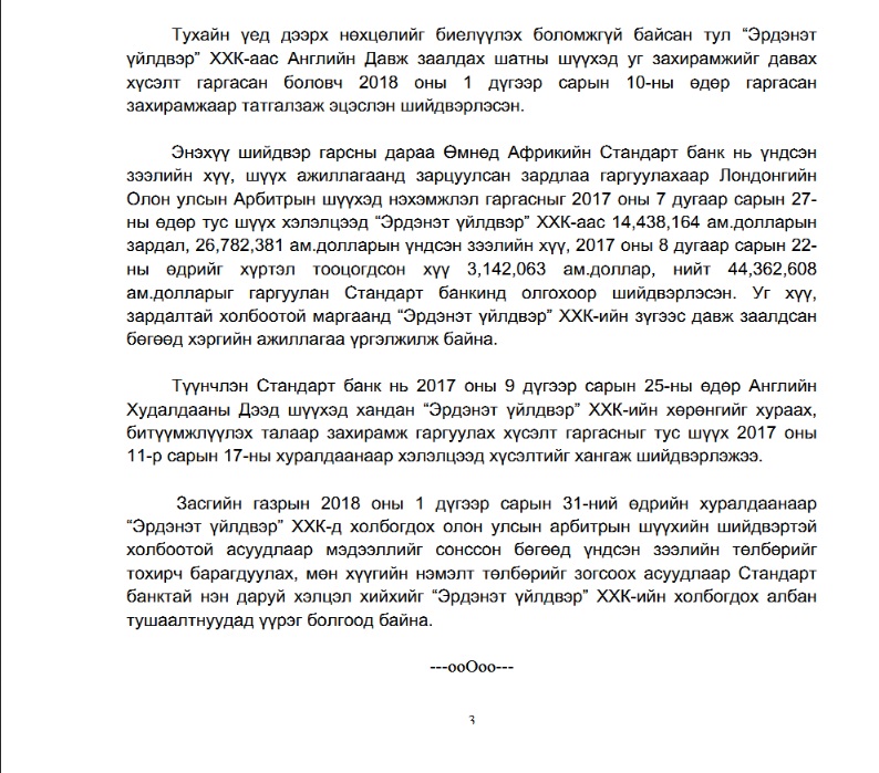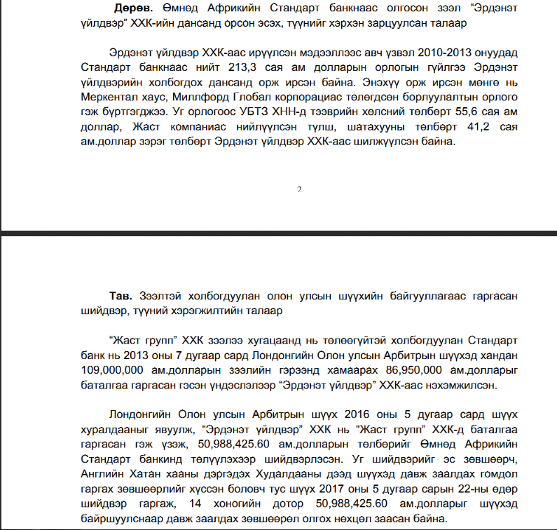 УИХ дахь Авлигын эсрэг парламентын бүлэг болох УИХ-ын гишүүн Х.Нямбаатар, Ж.Энхбаяр, Т.Аюурсайхан, Л.Оюун-Эрдэнэ, Л.Энхболд нар ”Эрдэнэт” үйлдвэрийн 51 хувь, Стандарт Банктай холбоотой асуудлаар Засгийн газарт асуулга тавьсан талаараа өмнө нь мэдэгдсэн. Тэд энэ талаар хэлэхдээ ”Эрдэнэт”-ийн тамга тэмдэг хуурамчаар ашиглаж баталгаа гаргуулсан гэж ярьдаг. Гэвч хэрэг дээр ажилласан нэр бүхий хүмүүс хэвлэлээр ярихдаа ”Стандарт” банкнаас зээлсэн мөнгө “Эрдэнэт”-ийн гадаад дахь харилцах дансаар орж, гарсан гэдэг мэдээлэл ирсэн. Энэ бол яавч бусдын өмнөөс хуурамчаар баталгаа гаргасан байх боломжгүй юм. Тиймээс энэ бүх мэдээллийг олон нийтэд ил тод болгооч гэдэг асуудлаар асуулт тавьж байна.