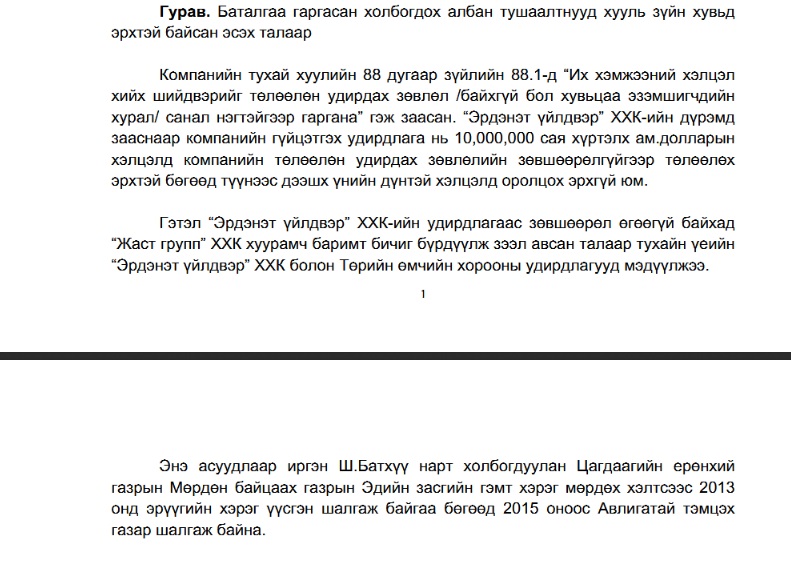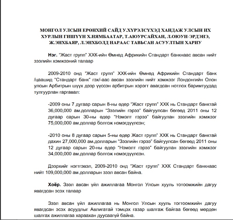 ХЭНД Ч ОЙЛГОМЖТОЙ УЛСЫН ХӨРӨНГИЙГ ДУР МЭДЭН ХУВИЙН ХЭВШИЛД БАРЦААЛУУЛАН ЗЭЭЛ ОЛГОСОН ТӨРИЙН ЭРХ МЭДЭЛТНҮҮД ҮҮНИЙХЭЭ ХАРИУД ИХ ХЭМЖЭЭНИЙ МӨНГӨН ШАГНАЛ ХУВЬДАА АВСАН НЬ ДАМЖИГГҮЙ ТЭГЭЭД Ч ТЭДНИЙ АМЬДРАЛ УРЬД ХОЖИД БАЙГААГҮЙГЭЭР ЭРС САЙЖИРСАН ЗАРИМ НЭГ НЬ ТӨРИЙН ХАМГААЛАЛТАНД ЗАЛАРЧ БАЙНА СҮҮЛД НЬ ХЭРЭГ БИШДЭЭД ИРЭХЛЭЭР БИЕ БИЕРҮҮГЭЭ ЧИХДЭГ ЗАРИМ НЬ ХУУРАМЧ ГАРЫН ҮСЭГ ЗУРСАН МЭТ ЯРЬЖ БАЙНА ЭНЭ ЯРИА МАШ ОЛОН ЖИЛ УДААН ЯРИГДЛАА МОНГОЛЫН ТӨРИЙН АППАРАТ ҮҮНИЙГ ЦЭГЦЛЭХИЙН ТӨЛӨӨ МАШ ХОЙРОГО ДУРГҮЙ АЖИЛЛАЖ БАЙНА ЭНЭ ХЭРЭГТЭЙ ХОЛБООТОЙ ХҮН БҮРИЙГ БАРИВЧЛАН АСУУДЛЫГ ТҮРГЭН ШИЙДВЭРЛЭХ ЦАГ НЬ БОЛСОН.