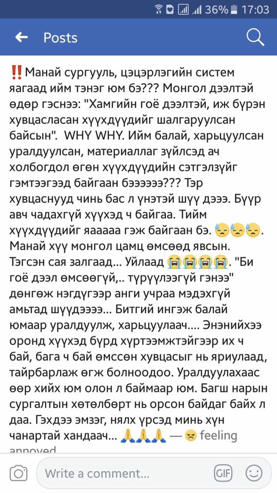 гэжээ. Түүний энэхүү мэдэгдлийг олон эцэг эх дэмжин санал сэтгэгдлээ уламжилсаар байна. Тэд үндэсний дээл хувцсаа өмсөхийг эсэргүүцээгүй. Гагцхүү хүүхэд багачуудыг хувцсаар нь дамжуулан ялгаварлаж байгааг анхаарахыг хүсжээ. Тэдний үзэж буйгаар, хэрэв үндэснийхээ хувцсыг хүүхэд багачууддаа өмсүүлж хэвшүүлэхээр бол нэгдсэн журмаар дунд сургуулийн сурагчдын дүрэмт хувцасны оронд өмсүүлж болохыг сануулжээ. Мөн хүүхдийг багаас нь эд хөрөнгөөр өрсөлдүүлж байгаа нь хожмоо эрдэм номын төлөө бус эрх мэдлийн төлөө өрсөлдөх тэмүүллийг ухамсарт нь суулгаж байна гэж онцолсон байна. Эцэст нь тэмдэглэхэд, "Эдээр биеэ чимэхээр, эрдмээр биеэ чим" гэсэн эртний сайхан үг бий сэн.