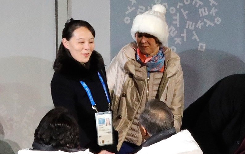 Ким Ё Чен Өвлийн Олимпийн нээлтийн үеэр Өмнөд Солонгосын ерөнхийлөгч Мун Жэ Интэй гар барьж мэндчилж байгаа нь.