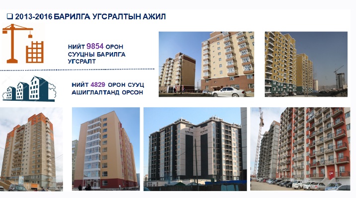 Энэ жил 5 мянган айлын орон сууц барихаар салбар яамны зүгээс төлөвлөжээ.Тодруулбал, БНХАУ-ын Засгийн газраас олгох 350.0 сая юанийн буцалтгүй тусламжаар “Ногоон нуур” орчмын түр суурьших орон сууцны хотхон” төсөл санаачилж, гэрээний нөхцөлийг тохирох, гүйцэтгэгчийг сонгон шалгаруулах, төслийг шуурхай эхлүүлэхээр ажиллаж байгаа аж. Уг хотхонд 21 давхар найман орон сууцны блок сууц, 960 хүүхдийн багтаамжтай дунд сургууль, 240 хүүхдийн багтаамжтай цэцэрлэг, 240 автомашины дулаан зогсоол барина.