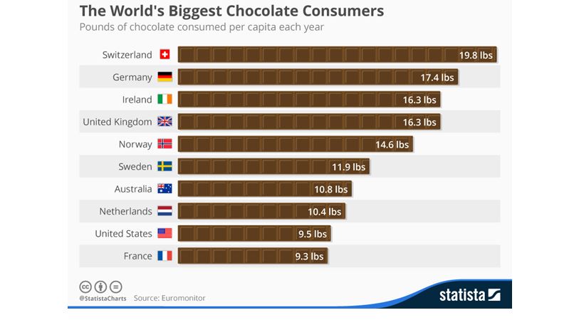 Олон улсын статистик мэдээнээс гаргасан шоколадны хэрэглээний судалгаагаар Шоколадны либерал улсаар Швейцарь тодорсон юм. Учир нь Швейцарь улсын шоколадны нэг хүнд ноогдох эрэлт хэрэгцээ 19.8 фунт (9кг) -аар нэгдүгээрт бичигджээ. Энэ хэрээрээ Швейцарь нь шоколад үйлдвэрүүдээрээ алдартай бөгөөд “Tobleron” брэнд нь дэлхийд танигдсан юм. Мөн Швейцарийн "Goldkenn" шоколад нь амт чанараараа дээгүүрт бичигддэг байна. Харин хөрш зэргэлдээ орших Герман улс нь хоёрдугаар байр эзэлдэг бөгөөд дунджаар нэг хүн жилд 17.4 фунт (7.9 кг) шоколад иддэг байна.