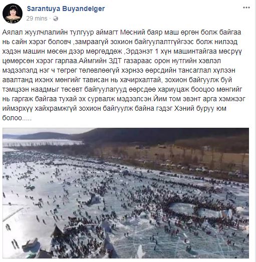 Хөвсгөл аймагт жил болгон зохион байгуулагддаг "Хөх сувд-2018" мөсний баяр өчигдөр болсон билээ. Тэгвэл тус баярын үеэр нэг хүн амиа алдсан харамсалтай мэдээлэл байна. Хэргийн тухай нэгэн сэтгүүлч өөрийн цахим хуудаснаа нийтэлжээ. Тодруулбал, Мөсний баярын эмх цэгцгүй зохион байгуулалтаас болж хэд хэдэн машин хоорондоо мөсөн дээр мөргөлдсөн хэрэг гарсан байна. Улмаар нэг хүн машинтайгаа мөс рүү цөмөрч амь насаараа хохирчээ.