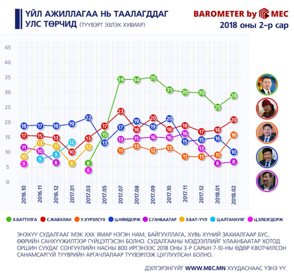 Судалгааны мэргэшсэн компани “МЕК” судалгааны байгууллага "Үйл ажиллагаа нь таалагддаг" улс төрчдийг тодруулах судалгааг иргэдийн дунд судалгаа явуулж, хэн нь зөв үйл ажиллагаа явуулдаг вэ гэдгийг асуужээ. Тус судалгаанд Улаанбаатар хотод оршин суудаг сонгуулийн насны 800 иргэн хамрагдаж, санамсаргүй түүврийн аргачлалаар явуулжээ.