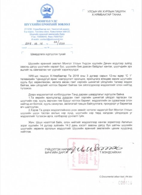 УИХ-ын гишүүн Х.Нямбаатар хэдхэн хоногийн өмнө “Цензургүй яриа” нэвтрүүлэгт оролцохдоо зарим шүүгчийг хууль бусаар хөрөнгөжсөн, авлига авдаг, үүнийг нь нотлох баримт өөрт нь байгаа гэж ойлгогдох зүйлийг ярьсан байдаг. Тэгвэл уг асуудалтай холбогдуулан Шүүхийн Ерөнхий Зөвлөлөөс Х.Нямбаатар гишүүнд үндсэн хоёр шаардлага тавьжээ. Нэгдүгээрт ярилцлагадаа дурдсан гэмт хэргийн шинжтэй үйлдэл гаргасан шүүгчийн нэр, гэм бурууг нотлох баримтыг нийтэд ил болгож, холбогдох хууль хяналтын байгууллагад шалгуулах, хоёрдугаарт мэдээллээ нотолж чадахгүй бол шүүх болон шүүгчийн нэр хүндэд халдсан үйлдэлдээ уг мэдээллийг түгээсэн хэлбэрээр уучлал гуйхыг шаардлаа.
