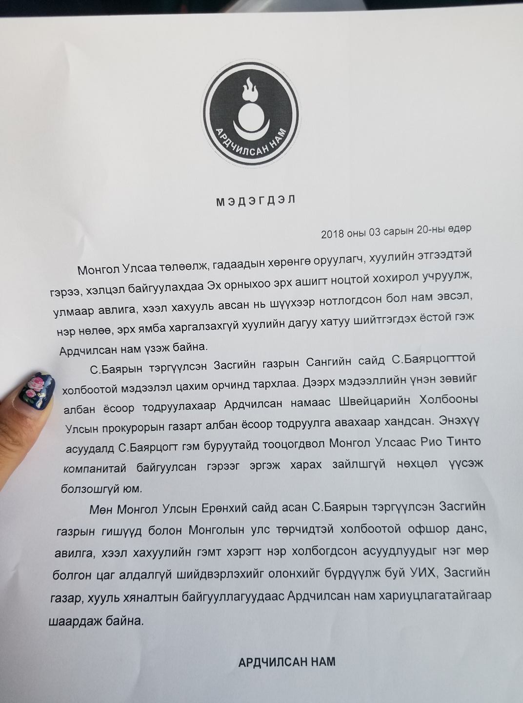 Ардчилсан намаас Швейцарийн улсын прокурорын газарт хандаж, тодруулга авах хүсэлт илгээжээ. Мөн одоогийн УИХ, Засгийн газар, хууль хяналтын байгууллагаас оффшор данс болон авилга хээл хахуультай нэр холбогдсон улстөрчидтэй яаралтай хариуцлага тооцож ажиллахыг шаардсан байна. Ингээд уг шаардах бичгийг хүргэе.
