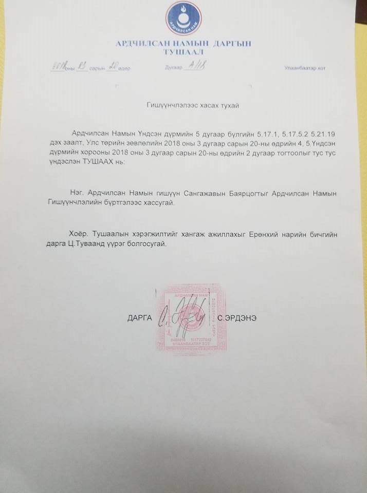 "Ардчилсан намын гишүүн С.Баярцогтыг Ардчилсан намыг гишүүнчлэлийн бүртгэлээс хассугай. Тушаалын хэрэгжилтийг хангаж ажиллахыг Ерөнхий нарийн бичгийн дарга Ц.Туваанд үүрэг болгосугай" гэжээ.