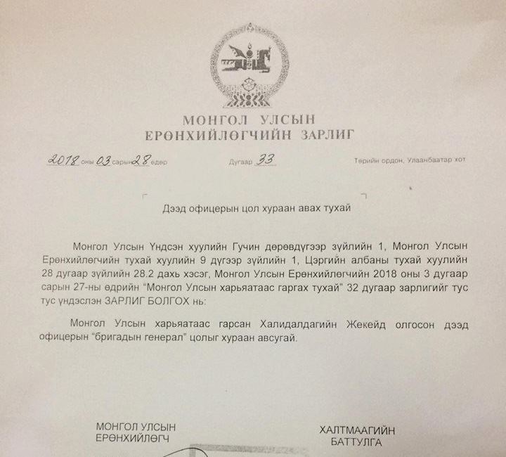 Монгол Улсын Үндсэн хуулийн Гучин дөрөвдүгээр зүйлийн 1, Монгол Улсын Ерөнхийлөгчийн тухай хуулийн 9 дүгээр зүйлийн 1, Цэргийн албаны тухай хуулийн 28 дугаар зүйлийн 28.2 дахь хэсэг, Монгол Улсын Ерөнхийлөгчийн 2018 оны 3 дугаар сарын 27-ны өдрийн “Монгол Улсын харьяатаас гаргах тухай” 32 дугаар зарлигийг тус, тус үндэслэн ЗАРЛИГ БОЛГОХ нь:Монгол Улсын харьяатаас гарсан Халидалдагийн Жекейд олгосон дээд офицерын “бригадын генерал” цолыг хураан авсугай” гэжээ.