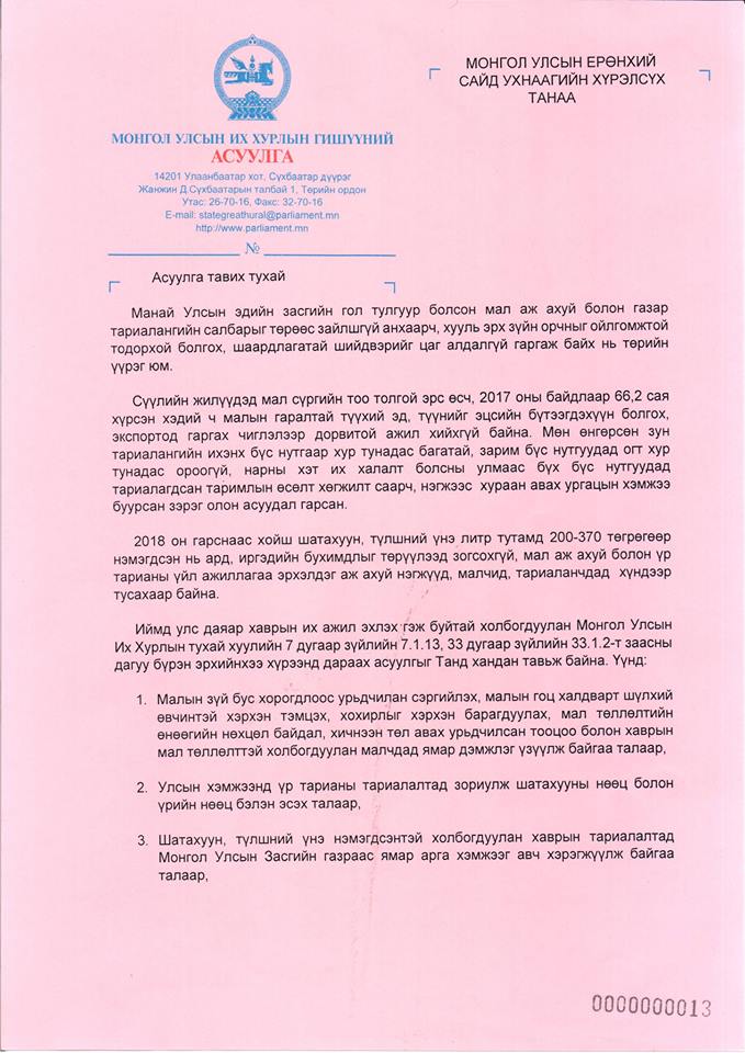 "Сүүлийн жилүүдэд мал сүргийн тоо өсч, 2017 оны байдлаар 66,2 сая хүрсэн хэдий ч малын гаралтай түүхий эд, түүнийг эцсийн бүтээгдэхүүн болгох, экспортод гаргах чиглэлээр дорвитой ажил хийхгүй байна" гэдгийг асуулгадаа дурдсан байна.