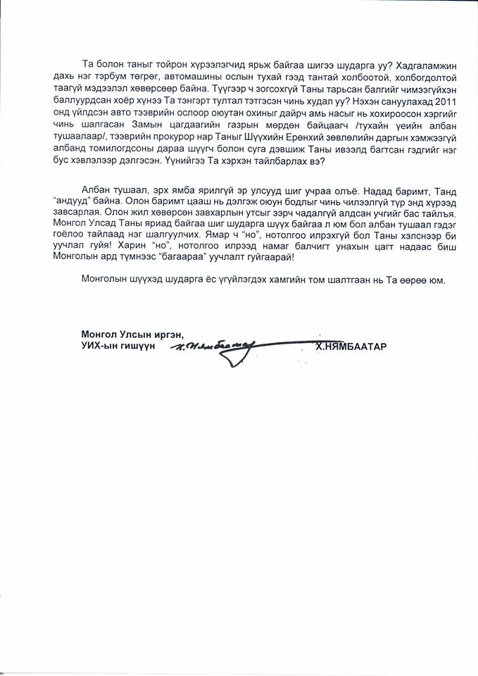 УИХ-ын гишүүн Х.Нямбаатар Монгол Улсын Шүүхийн ерөнхий зөвлөлийн дарга Н.Лүндэндоржид ил захидал явуулжээ.