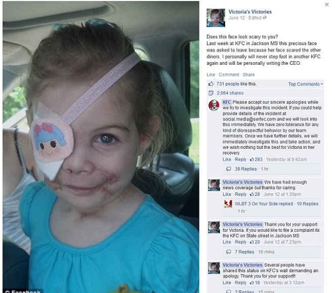 Дээрх жишээтэй адил ёсзүйгүй үйлдэл 2014 онд АНУ-ын Миссиссипи мужийн Жэксон хотод орших KFC түргэн хоолны газарт гарч байсан юм. Эмээтэйгээ хоол идэхээр орсон гурван настай Викториа охиныг хөөсөн талаар цахим сүлжээгээр тархаж байсан нь саяхан. Хөөсөн шалтгаан нь ердөө түүний царай. Нохойд уруулж өрөөсөн нүдээ алдаж, нүүрний нэг тал нь хөдөлгөөнгүй, мэдрэлгүй үлдсэн охины царайг харсан үйлчлэгч "охины царай бусад үйлчлүүлэгчдийг маань айлгаад байна. Тиймээс эндээс гарна уу" хэмээн хөөсөн аж. Охины гэр бүл энэ хэргийг зүгээр орхихыг хүссэнгүй. Энэ мэдээг цахим сүлжээнд байрлуулж, зургийг нь тавиад "Энэ царай таныг үнэхээр айлгаж байна уу?" гэсэн нь хүмүүсийн дунд сенсаци дэгдээд байсан юм.