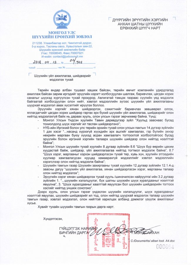 Албан бичигт эрүүгийн хэргийг хянан шийдвэрлэх, сэжигтнийг баривчлах зөвшөөрөл олгох, яллагдагчийг цагдан хорих шийдвэр гаргах эрх бүхий шүүхийг үйл ажиллагаа, шүүхийн шийдвэрийг олон нийтэд мэдээлэхгүй байх нь Монгол Улсын хэд хэдэн хууль болон олон улсын гэрээг зөрчихөөр байгааг онцолжээ.