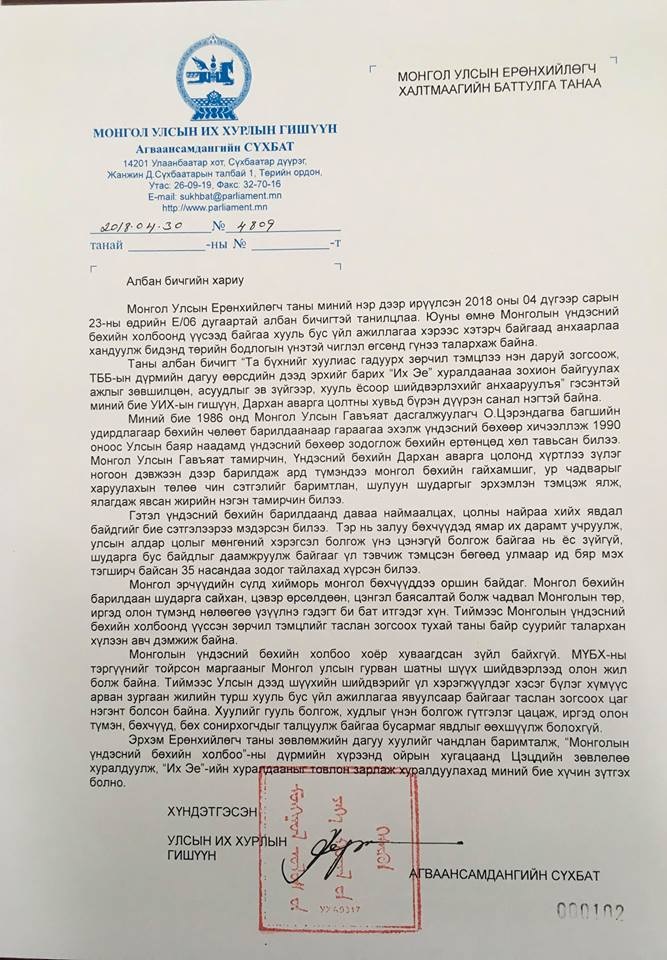 Монгол Улсын Ерөнхийлөгч таны миний нэр дээр ирүүлсэн 2018 оны 04 дүгээр сарын 23-ны өдрийн Е/06 дугаартай албан бичигтэй танилцлаа. Юуны өмнө Монголын үндэсний бөхийн холбоонд үүсээд байгаа хууль бус үйл ажиллагаа хэрээс хэтэрч байгаад анхаарлаа хандуулж бидэнд төрийн бодлогын үнэтэй чиглэл өгсөнд гүнээ талархаж байна.