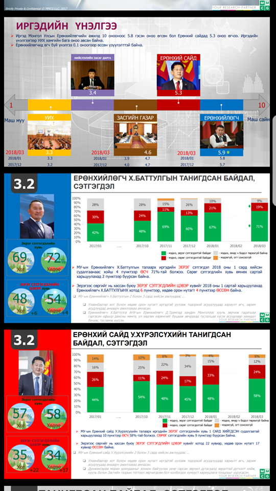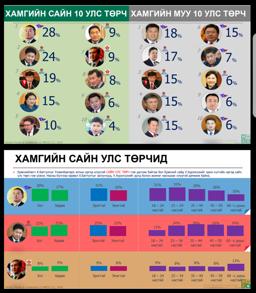 Судалгааны байгууллагуудын дүнгээс харахад дээрх улстөрчдөөс гадна УИХ-ын гишүүн Ж.Батзандан, Я.Санжмятав, С.Жавхлан нарын нэрс эхний 10 дотор жагссан нь ч иргэд олон нийт чухам юу хүсэж байгааг илтгэж байгаа хэрэг. Нөгөө талаар Ерөнхий сайдын нэр бүгдэд нь хоёрт жагссан байгаа нь хувь улстөрчөөс гадна өнөөдрийн Засгийн газрын хийж хэрэгжүүлсэн ажил, хэрэгжүүлэхээр төлөвлөж буй ажлууд нь сонгогч олны таашаалд нийцэж байгааг харуулсан явдал юм. Үүнээс харвал сонгогчид зөвхөн хувь улстөрчийн байр сууринаас бус Засгийн газрын ажилд ч давхар дүн тавьсныг харж болно. Мөнхүү Х.Баттулга Ерөнхийлөгч, Ц.Нямдорж сайд нар дөрвөн судалгааны байгууллагын тандалтад байнга тэргүүлж, эхний тавд багтаж байгаагийн цаана сонгогч олон шударга ёс тогтоох үйлсийг уухайлан дэмжиж байгаа харуулж байна.