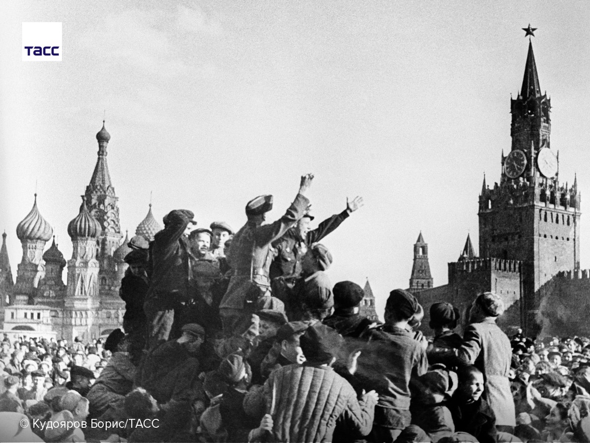 Үүний дараа ЗСБНХУ-ын удирдагч И.В.Сталин ард түмэндээ хандаж хэлсэн үгэндээ “Эх орны дайн бидний бүрэн ялалтаар өндөрлөлөө. Нөхөд өө! Эх орон нэгт эрэгтэй, эмэгтэй ард иргэд ээ! Өнөөдөр Германыг ялсан аугаа ялалтын өдөр. Улаан арми болон манай холбоотнуудын дайчдын өмнө фашист Герман өвдөг сөхрөн ялагдлаа хүлээн зөвшөөрч, үг дуугүй бууж өглөө” гэж байв.