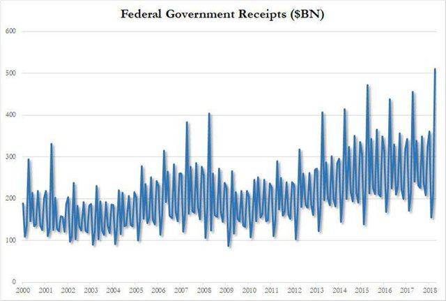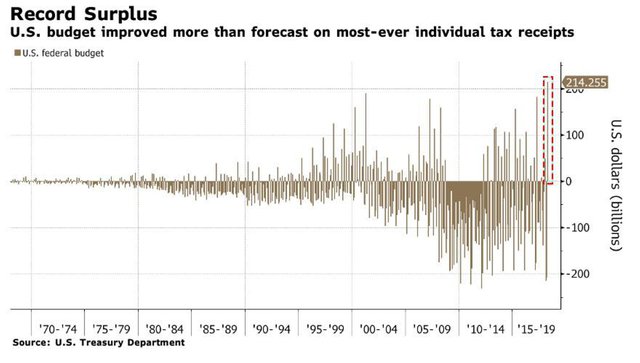 Дөрөвдүгээр сард 500 гаруй тэрбум доллар төсөвт орж ирсэн нь түүхэн дэх энэ сарын хамгийн өндөр орлого бөгөөд тухайн сард хамгийн хүчтэй эдийн засгийн идэвхжил тохиолдлоо хэмээн АНУ-ын Конгрессийн Төсвийн байнгын хороо дүгнэсэн байна.
