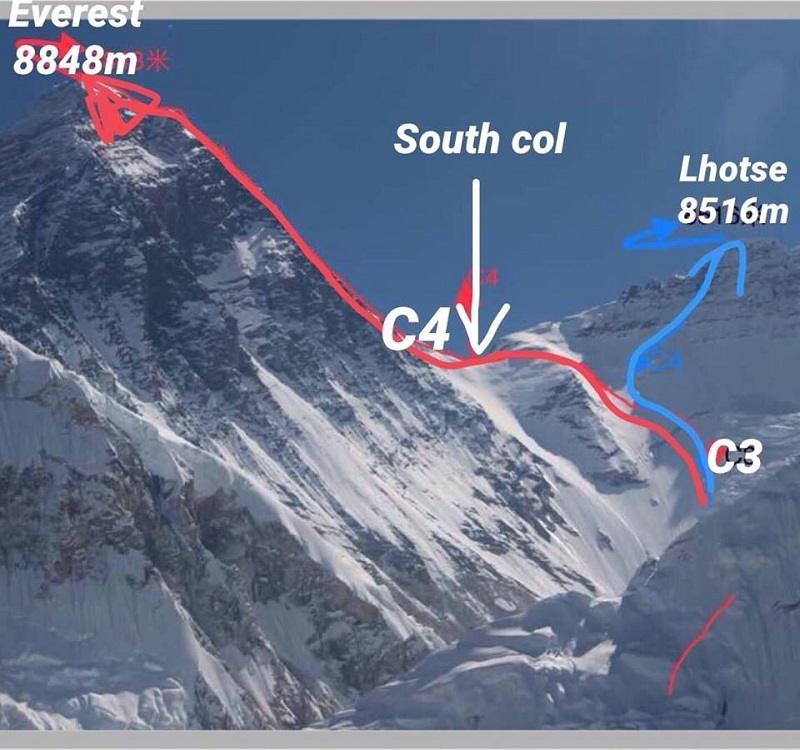 Сонирхуулахад: Эверест болон дэлхийн дөрөв дэх өндөр оргил Лхоцэ-д нэг замаар өгсөж байгаад С3 буюу 3-р отогийн дээрээс авиралтын замууд нь салдаг аж. Доорх зураг дээр цэнхэр өнгөөр баруун гар талын Лхоцэ оргилд авирах, улаанаар Эверестийн оргилд авирдаг үндсэн замыг тэмдэглэн харуулжээ. С4 буюу 4-р отог далайн түвшнээс дээш 7900м өндөрт "South col" буюу Эверест, Лхоцэ оргилуудын дундах "Эмээл" дээр байрладаг ба эндээс багууд оройдоо, шөнөдөө хөдөлж, "Summit push" буюу оргилын дайралтаа хийдэг аж.
