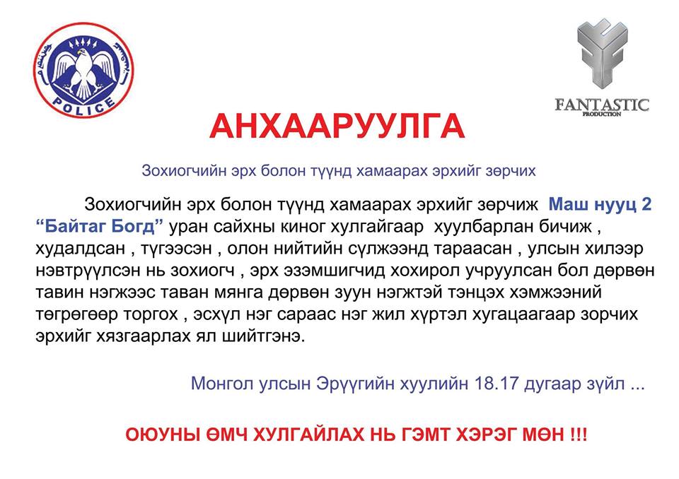 2018 оны гуравдугаар сарын 1-нд нээлтээ хийсэн Маш нууц-2 буюу “Байтаг богд” уран сайхны кинон дээр ч оюуны өмчийн хулгай гарч, уран бүтээлчдийн зүгээс нэгэн анхааруулга гаргаж байсан билээ.
