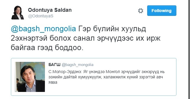 Монгол Улсын Гэр бүлийн тухай хуулийн 4.2.2-д “Монгол Улсад эрэгтэй хүн хууль ёсны нэг эхнэр, эмэгтэй хүн хууль ёсны нэг нөхөртэй байна” хэмээн заасан байдаг. УИХ-ын гишүүн асан С.Одонтуяа парламентад сууж байхдаа “Гэр бүлийн тухай хуульд хоёр эхнэртэй болох заалт тусгуулах санал эрчүүдээс олноор ирж байгаа” хэмээн олон нийтийн сүлжээ хуудсаараа мэдээлж байсан билээ.