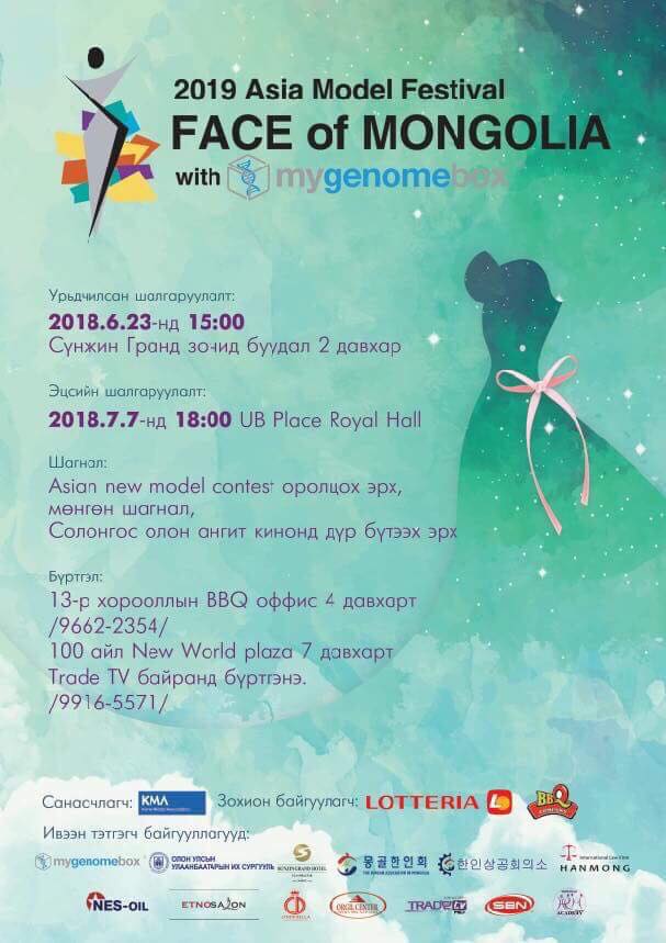 "Face of Mongolia" тэмцээн 12 дахь удаагаа зохион байгуулагдах гэж байна. Тэмцээнд оролцогчдийн бүртгэл явагдаж байгаа бөгөөд урьдчилан шалгаруулалт 2018 оны 06 сарын 23-нд 15:00 цагаас Сүнжин Гранд зочид буудалд болно. Эцсийн шалгаруулалт 2018 оны 07 сарын 07-нд "UB palace"-д явагдах юм.