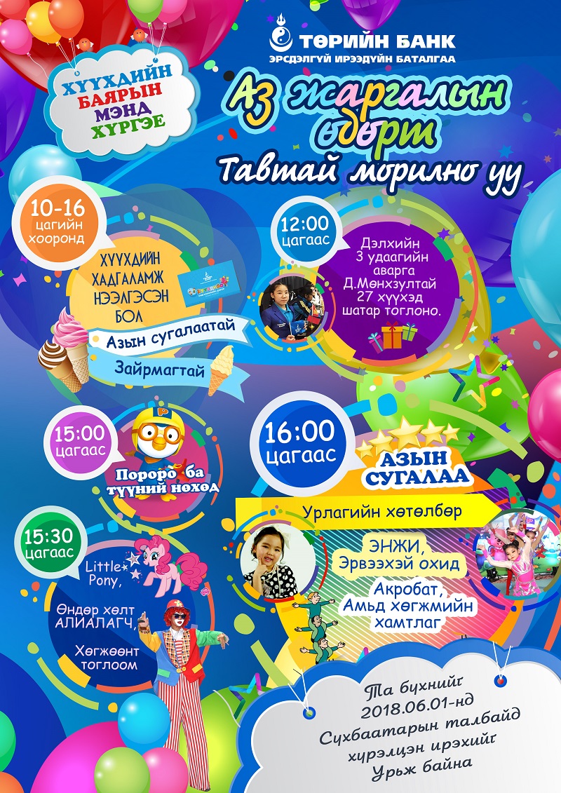 Төрийн банкнаас зохион байгуулж буй “Аз жаргалын өдөр” хүүхдийн баярын өдөрлөгт урьж байна