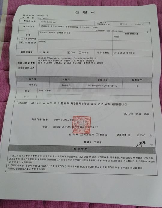 Нуруу нь тэсвэрлэхийн аргагүй өвдөн хоёр сар эмчилгээ хийлгэсэн ч сүүлдээ гишгэж чадахгүй болжээ. Улмаар хөлийн 10 хуруу нь хөдлөхөө байж, хэвтэрт оржээ. Ингээд эмнэлэгээр дахин явж, мэдрэл, нугас, нурууны ясны сүрьеэ гэх оноштойгоор 15 цаг үргэлжилсэн хүнд хагалгаанд орсон байна. Ингэхдээ уушгины болон нурууны үений хагалгаа хийлсэн бөгөөд нурууны найман үе нь өвчилж идэгдсэн байж. Түүнийг нь хагалгаагаар орлуулж хадсан байна.