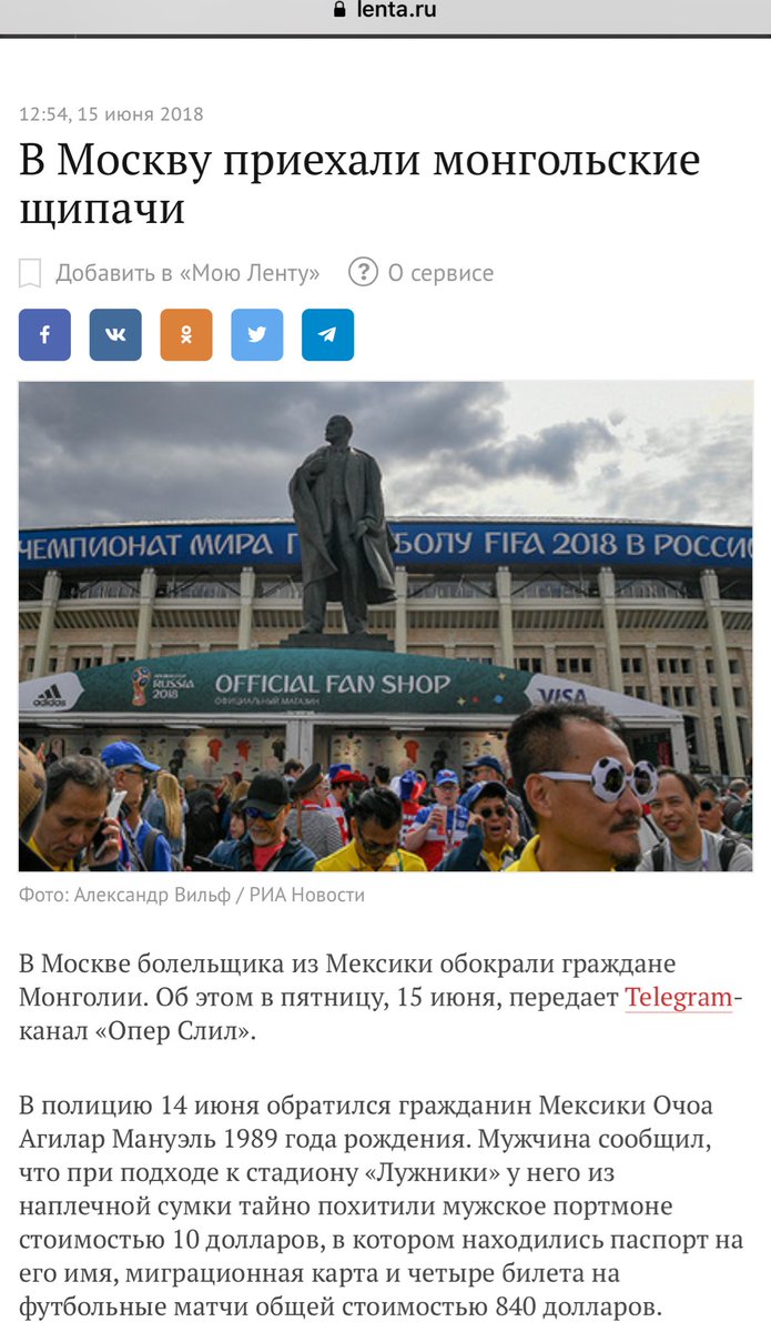 Оросын сайтад мэдээлснээр, өчигдөр Мексикийн иргэн, 29 настай Очоа Агилар Мануэль цагдаад хандан, "Лужники" цэнгэлдэх хүрээлэн рүү орохоор явж байхдаа цүнхэн дотроосоо хэтэвчээ алдсан хэмээн мэдэгджээ. Түүн дотор нь паспорт, нийт 840 долларын үнэ бүхий тэмцээн үзэх дөрвөн ширхэг тасалбар байсан аж.