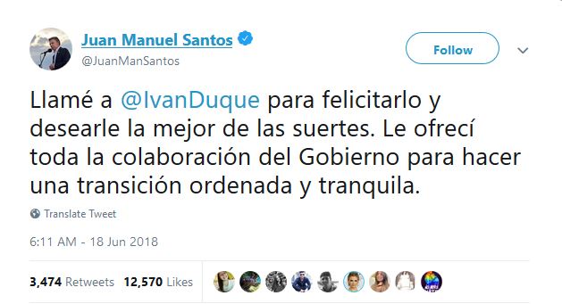 Тус улсын одоогийн Ерөнхийлөгч Хуан Мануэль Сантос түүнийг ялсан явдалд баяр хүргэжээ. Тэрээр Дукед хамгийн сайн сайхан бүхнийг хүсээд, төрийн эрх мэдлийг шилжүүлэх явдал нягт нямбай, тайван явагдахад тусламж үзүүлэхээ амласан аж. Энэ тухайгаа тэрээр өөрийн твиттер хуудаснаа мэдээлсэн байна.