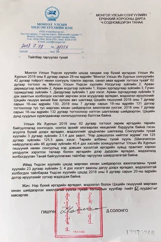 УИХ-ын сонгуулийн 42 дугаар тойрогт нөхөн сонгууль товлон зарлах, санал авах өдрийг тогтоох тухай УИХ-ын 62 дугаар тогтоол Үндсэн хууль зөрчсөн хэмээн нэр бүхий иргэд Үндсэн хуулийн цэцэд гомдол гаргасан. Энэ дагуу Цэц маргаан үүсгэн шалгаж, дунд суудлын хуралдаанаар хэлэлцүүлэхээр болсон. Үүнтэй холбоотойгоор Цэц наймдугаар сарын 20-ны дотор тайлбар гаргуулах тухай албан бичгийг Сонгуулийн Ерөнхий Хороонд энэ сарын 18-нд хүргүүлсэн байна.