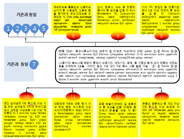 - Байнгын зорчигч - БНСУ-руу сүүлийн хоёр жилийн дотор 4 ба түүнээс дээш, нийт 10-аас дээш (сүүлийн 2 жилд заавал нэг удаа зорчсон байх) зорчсон иргэн