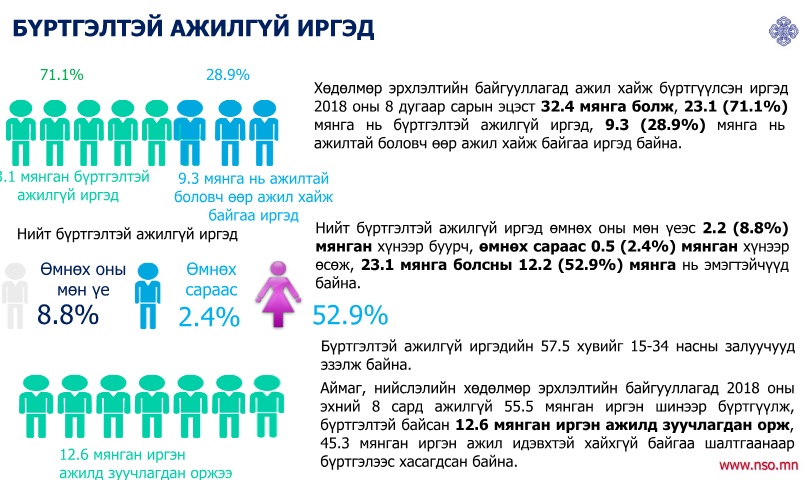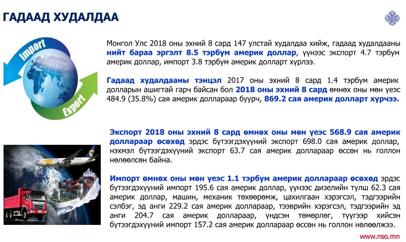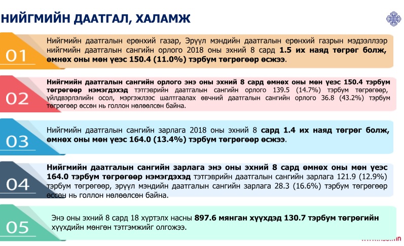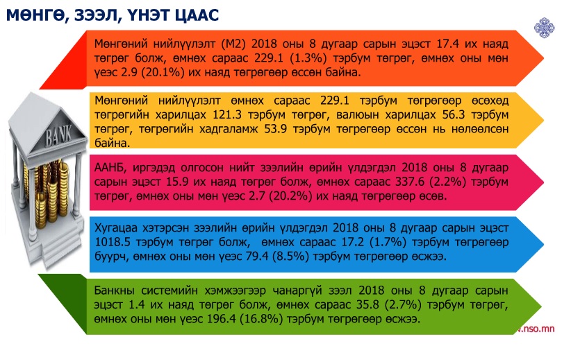 Наймдугаар сарын байдлаарх нийгэм, эдийн засгийн үзүүлэлтүүдээс дурдахад хэрэглээний бараа, үйлчилгээний үнэ өмнөх сараас 0.8 хувиар буурч, өмнөх оны мөн үеэс 6 хувиар өсчээ. Манай улс наймдугаар сарын байдлаар 147 улс оронтой худалдаа эрхэлсэн байна. Мөнгөний нийлүүлэлт 17,4 их наяд болж өмнөх сараас 1.3 хувь өссөн бол өмнөх оны мөн үеэс 20.1 хувь буюу 2.9 их наяд төгрөгөөр нэмэгдсэн байна. Эдийн засаг, нийгмийн салбарын тоон үзүүлэлтүүдийг хүргэе.