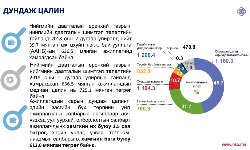 Үндэсний Статистикийн Хороо ажиллагсдын сарын дундаж цалинг 2000-2013 онд аж ахуйн нэгж, байгууллагад суурилсан түүвэр судалгааны үр дүнгээр тооцож байсан. Харин 2014 оноос эхлэн мэдээллийн эх үүсвэрийг өөрчилж, Нийгмийн Даатгалын Ерөнхий Газрын Нийгмийн даатгалын сангийн мэдээлэлд үндэслэн тооцож байна. Нийгмийн Даатгалын Ерөнхий Газрын Нийгмийн даатгалын шимтгэл төлөлтийн тайланд 2018 оны хоёрдугаар улиралд 39.7 мянган аж ахуйн нэгж, байгууллагын 636.5 мянган ажиллагчид хамрагджээ.