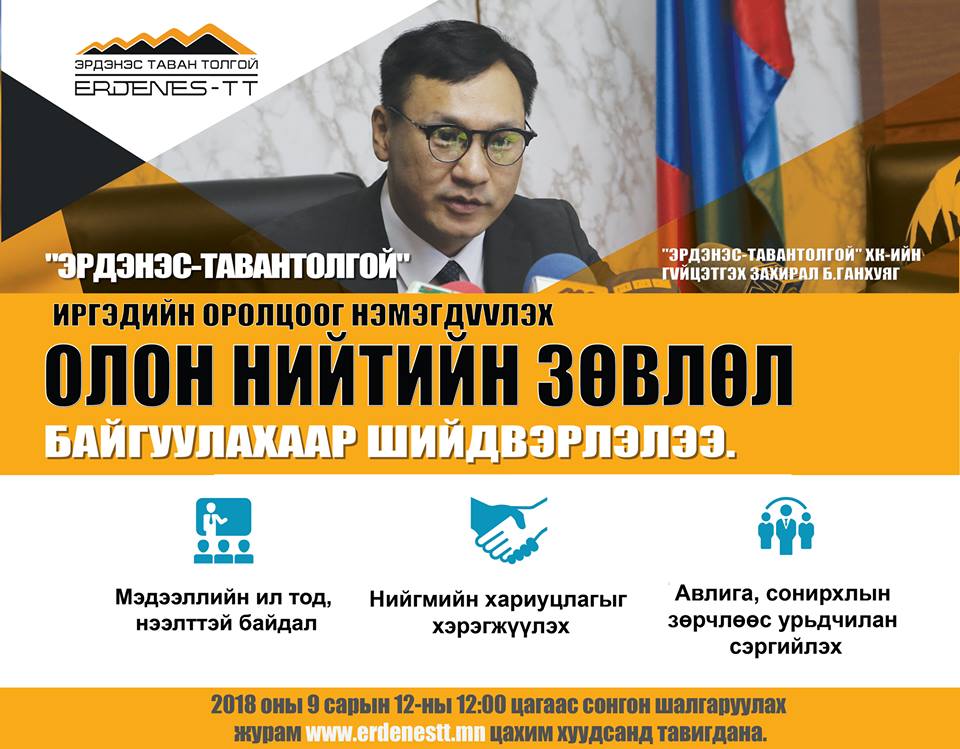 Монгол Улсын хувьд анх удаа бизнесийн байгууллага дэргэдээ олон нийтийн зөвлөл байгуулах гэж байна. Мөн нүүрс худалдан авах гэрээнүүдийг олон нийтэд нээлттэй танилцуулж, туслан гүйцэтгэгч болон толгой компанид орох ямар ч хүнийг нээлттэй сонгон шалгаруулалтаар оруулах болсон зэрэг олон мэдээллийг өнөөдөр “Эрдэнэс-Тавантолгой” ХК-ийн гүйцэтгэх захирал Б.Ганхуяг өнөөдөр /2018.09.12/ зарлалаа.