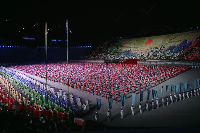 Мөн өдрийн орой Пхеньян хотноо дэлхийд хамгийн их хүн оролцсон гимнастикийн үзүүлбэрийг “Майн өдөр” нэртэй стадионд үзэж сонирхжээ. Энэхүү суртал ухуулгын “Гайхамшигт орон” үзүүлбэрийг БНАСАУ байгуулагдсаны 70 жилийн ойг тэмдэглэх хүрээнд есдүгээр сарын 9-ний өдөр анх үзүүлсэн байна. Мүн Жэ Ин хэдэн арван мянган гимнастикчдын оролцсон үзүүлбэрийг үзэхээр цугласан 150 мянга орчим солонгосчуудад хандан үг хэлснийг Сөүл шууд дамжуулсан юм. Тэрбээр "Бид цөмийн зэвсгээс ангид, цөмийн заналхийллээс ангид, энх амгалан улс орныг хойч үедээ өвлүүлэх амлалт өглөө" хэмээн цугласан олонд хандан хэллээ.