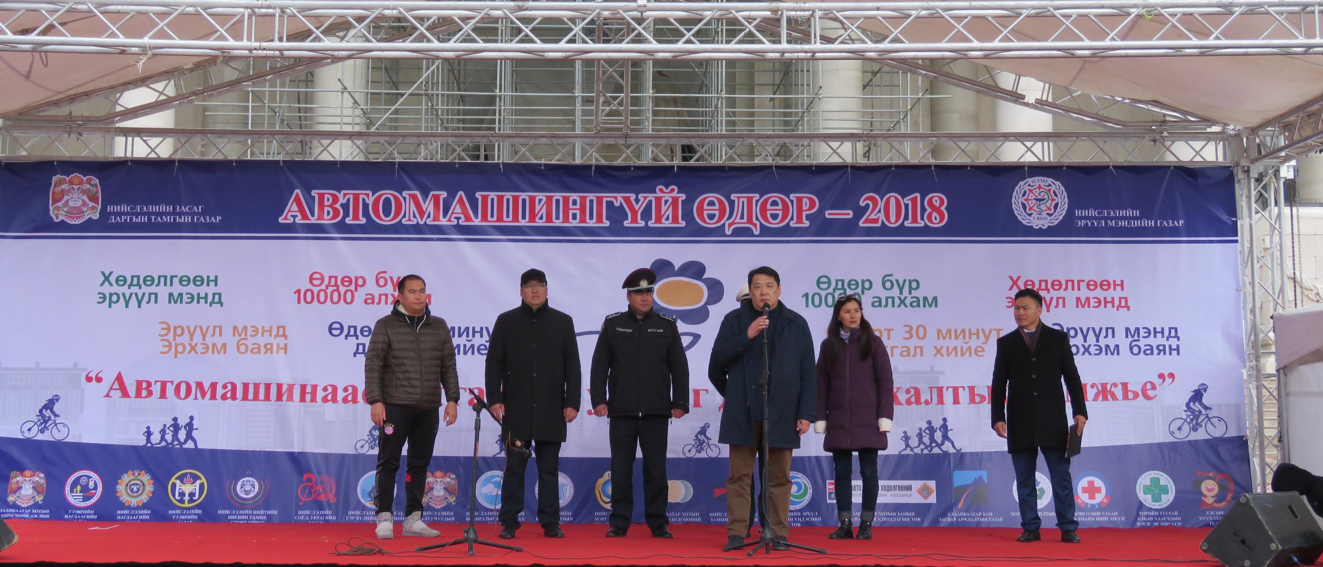 Өдгөө найм дахь жилдээ тэмдэглэж байгаа энэхүү өдрийг “Автомашинаас татгалзаж, унадаг дугуй, алхалтыг дэмжье” уриан дор НЗДТГ, НЭМГ, НЦГ-аас хамтран зохион байгуулж байна. “Автомашингүй өдөр”-т зориулсан урлаг, спортын арга хэмжээний нээлтэнд НЗДТГ-ын Нийгмийн бодлогын хэлтсийн дарга М.Эрдэнэжаргал, Нийслэлийн Эрүүл мэндийн газрын дарга Л.Төмөрбаатар, ЦЕГ-ын Тээврийн Цагдаагийн албаны Урьдчилан сэргийлэх хэлтсийн ахлах мэргэжилтэн, цагдаагийн хошууч Б.Лхагважаргал, Нийслэлийн цагдаагийн газрын Урьдчилан сэргийлэх хэлтсийн дарга, цагдаагийн дэд хурандаа Л.Амармөрөн, Нийслэлийн Соёл урлагийн газрын Соёлын хэлтсийн дарга М.Мөнхсайхан болон албаны бусад хүмүүс оролцлоо.