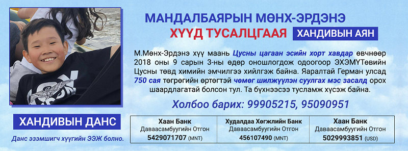 Хэвлэл мэдээллийн албанд ажилладаг ах эгч нар, маркетингийн мэргэжилтэй залуус та бүхэн энэхүү мэдээллийг цаг алдалгүй өөрийн танил талаа ашиглан сайтууд, өдөр тутмын сонин сэтгүүл, телевизороор дотоод мэдээгээр гаргах дээр тусалж дэмжинэ үү. Мөн өөрийн FACEBOOK хуудсандаа шейр хийж, өөрийн хүрээлэлд тус аяныг дэмжин, хүүгийн ээжийн данс болох ОТГОН-ы ХААН банкны 542907 1707 данс руу сайн дураар доод тал нь 1,000 төгрөг дээд тал нь 10,000 төгрөг шилжүүлэхийг хүсье.
