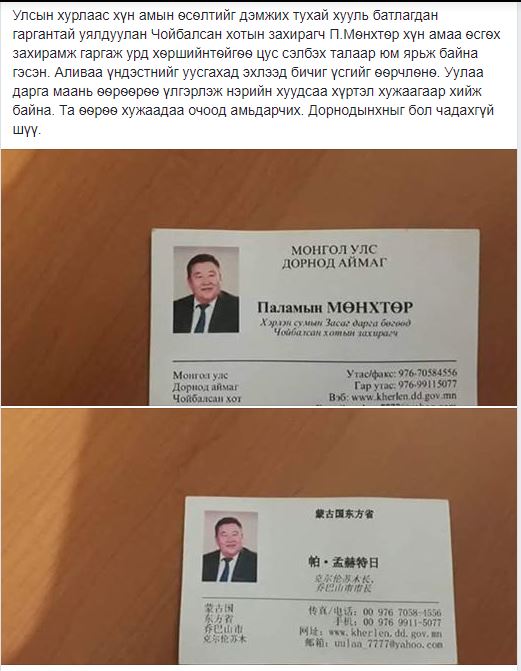 “Эх оронч иргэдийн нэгдсэн групп”, “Босоо хөх Монгол” зэрэг цахим нэгдлээр сүүлийн өдрүүдэд Дорнод аймгийн Чойбалсан хотын захирагч П.Мөнхтөр хятад хэл дээр бичсэн нэрийн хуудас хэвлэсэн тухай шуугисан. Тэгвэл хотын захирагч П.Мөнхтөр өөрөө энэ мэдээллийг няцаалаа. Улаанбаатарт ирж, хэвлэлийнхэнд мэдээлэл хийсэн тэрбээр "Засаг даргаар томилогдсоноосоо хойш ч, өмнөх Засаг дарга нар ч хятад танилцуулгатай нэрийн хуудас хэвлэж байгаагүй" гэж мэдэгдэв.