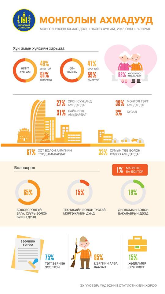 Үндэсний статистикийн хорооноос ахмадуудтай холбоотой зарим тоон мэдээллийг инфографикаар танилцуулсныг хүргэе.