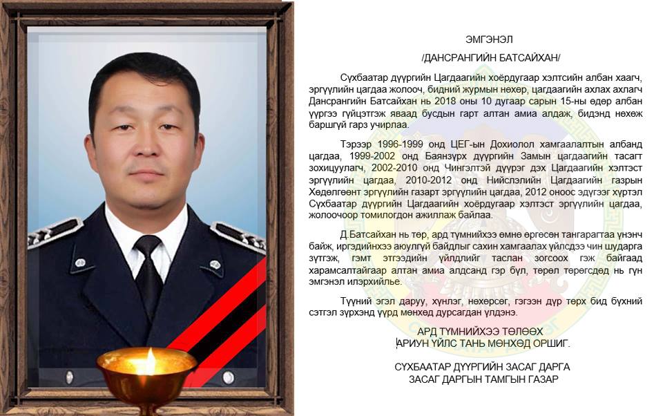 Нийслэл хотынхоо иргэдийн аюулгүй байдлын төлөө гэмт хэрэг, зөрчлийг таслан зогсоож, эрэн сурвалжлагдаж байсан гэмт этгээдийг илрүүлэхээр албан үүргээ гүйцэтгэж яваад амь насаа алдсан Д.Батсайханд иргэд, төрийн байгууллагын удирдлагууд эмгэнэл илэрхийлсээр байна.