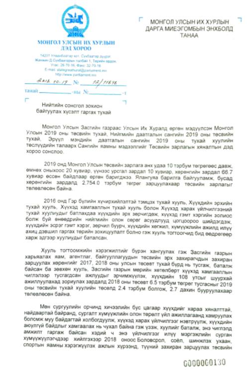 УИХ-ын гишүүн З.Нарантуяа Хүүхдийн хөгжил, хамгааллын төсвийн хяналтын талаар нийтийн сонсгол явуулах санал гаргажээ. Улмаар өнөөдөр /2018.10.19/ УИХ-ын дарга М.Энхболдод нийтийн сонсгол явуулах саналаа өргөн барилаа.