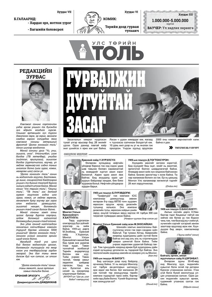 Долоо хоног тутмын "Толь" сонины анхны дугаар хэвлэгджээ. Энэхүү сонин нь 20.000 хувиар хэвлэгдэн гарч, орон даяар үнэгүй тараагдах юм. Шог зураг, нийтлэл, ярилцлага, комик, ваучер, купон зэрэг маш олон бэлэгтэй гэдгээрээ давуу талтай. Сонины эхний дугаарт "Шунхлай" группийн ерөнхийлөгч П.Батсайхан уригдан, дэлгэрэнгүй ярилцлага өгчээ. Мөн "Асашёорюүгийн 14 үнэн" нөхөрсөг шог, "Гурвалжин дугуйтай засаг" зэрэг уншууртай нийтлэл багтжээ.