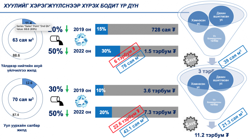 Ингээд эхний мэдээллийг БОАЖЯ-ны Усны нөөцийн хэлтсийн дарга Л.Эрдэнэбулган хүргэлээ. Тэрээр Ус бохирдуулсны төлбөрийн тухай хуульд нэмэлт, өөрчлөлт оруулах тухай хуулийн төслийн үзэл баримтлалыг 2017 оны арваннэгдүгээр сард баталсан. Үндэсний статистикийн газраас ААНБ-ын тооллогыг 1991, 1994, 1998, 2006 онуудад улс орон даяар улсын төсвийн санхүүжилтээр явуулж, үр дүнг нэгтгэж гаргасан. 1991, 1994 онд явуулсан тооллогод эдийн засгийн үйл ажиллагааны зарим хэсгийг хамруулж, тоологдох аж ахуйн нэгж, байгууллагын ажиллагчдын тоонд хязгаар тавьж байсан бол 1998 онд явуулсан тооллогод бүх төрлийн аж ахуйн нэгж, байгууллагыг хамруулж, эдийн засгийн бүх төрлийн үйл ажиллагааны олон улсын стандарт ангилал (ISIC)-ыг нэвтрүүлж, ҮСГ-т регистрийн санг уг ангиллын дагуу байгуулж, регистрийн сангийн баяжилтыг улирлаар хийж, түүвэр судалгааны хамрах хүрээ болгон ашиглах боломж нөхцлийг анх бүрдүүлсэн байна. Ус бохирдуулсны төлбөрийн тухай хууль батлагдах үед буюу 2012 онд эдийн засгийн бодит өсөлт (ДНБ) 12.9 хувь байсан бол 2016 онд 1.1 хувь буюу 2012 онтой харьцуулахад эдийн засгийн бодит өсөлт даруй 11.7 дахин буурсан. 2016 онд Ус бохирдуулсны төлбөрийн тухай хуульд нэмэлт, өөрчлөлт оруулах тухай хуулийн төслийн үзэл баримтлалыг боловсруулахдаа улс орны өмнө тулгамдаад байсан эдийн засгийн хүндрэлтэй нөхцөл байдлыг харгалзан үзэж “Аюултай бохирдуулах бодис”-оос бусад бохирдуулах бодисын төлбөрийн доод хэмжээг бууруулсан гээд хуулийн төслийн нөлөөлөл болоод хүрэх үр дүнгийн талаар дэлгэрэнгүй мэдээлэл хийв.