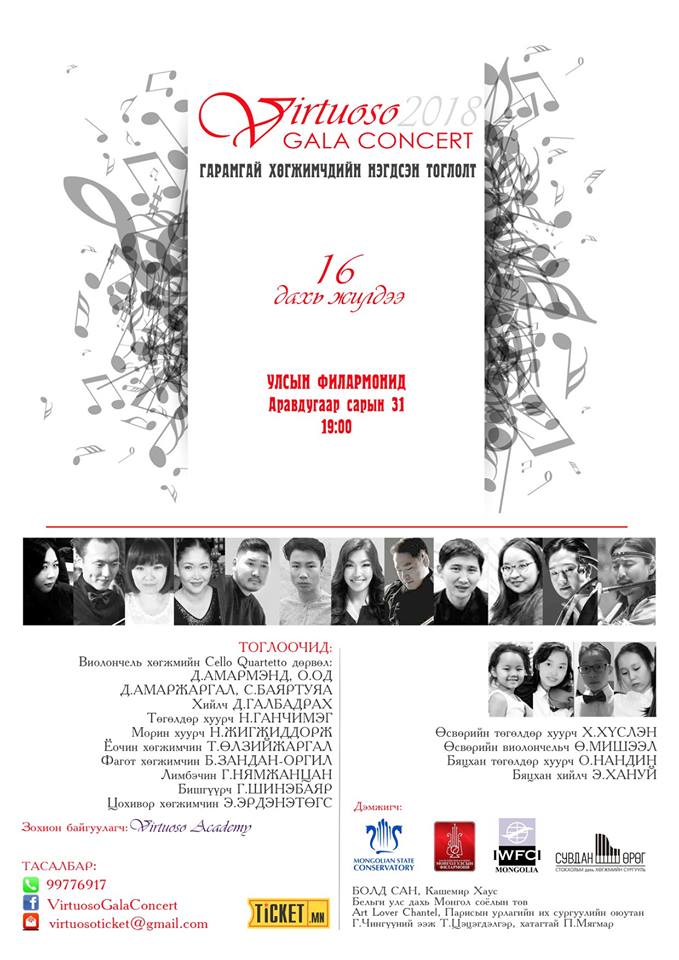 Гарамгай хөгжимчдийн “Virtuoso Gala Concert” 16 дахь жилдээ энэ сарын 31-нд Улсын филармонийн концертын танхимд болох гэж байна. Тоглолтод цөөн тооны, тухайн онд уран бүтээлийн амжилт гаргасан хөгжимчид, дуучдыг урьдаг. Хөгжим бүжгийн коллежийн, мэргэжлийн улсын болон олон улсын уралдаанд онцгой амжилт үзүүлсэн оюутан, сурагчдаас урьж томчуудтэй нэгэн тайзнаа тоглох боломж олгодог уламжлалтай нь онцлог. Тус коллежийн багш нар “Бид энэ тоглолтод шавь нараа оролцуулахсан гэсэн хүсэл, тэмүүлэлтэй болсон. Хүүхдүүд ч хичээдэг. Тэр жилдээ олон улсын уралдаанд амжилттай оролцсон нь энэ жил би “Virtuoso”-д тоглох болов уу” гэж битүүхэн чагнадаг болсон санагддаг. Энэ бол үр дүн” хэмээн ярьж байна.